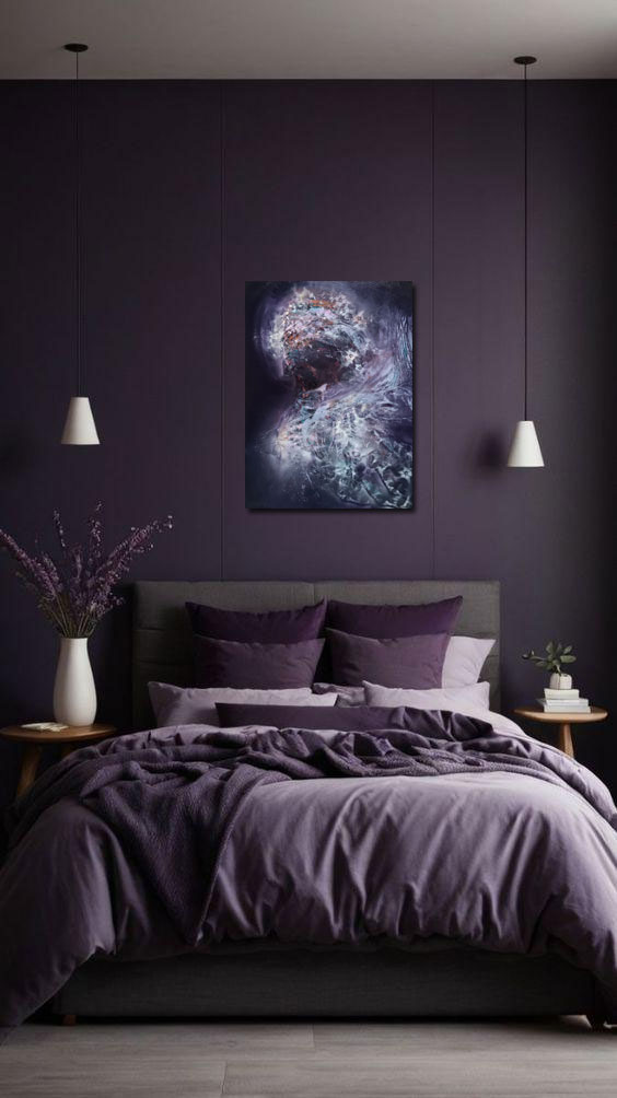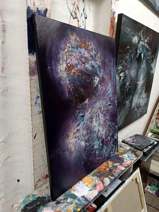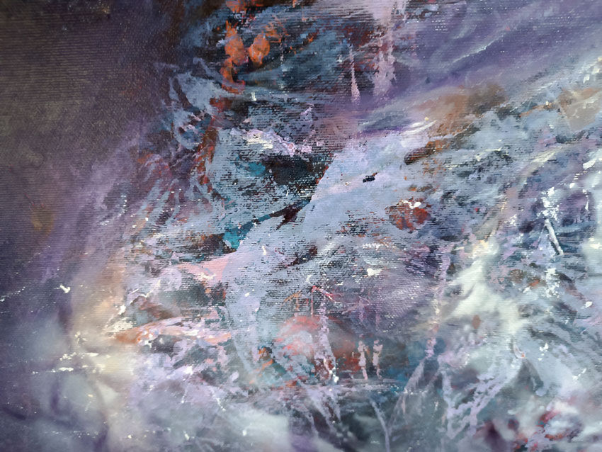 The painting presents a figure emerging from the depths, illuminated by a beautiful cold night light that enhances the color contrasts throughout the canvas. It creates an oneiric atmosphere, inviting viewers into a dreamlike experience. The interplay of deep purples and hints of soft blues fosters a visual vibration that encourages exploration of the intricate relationship between light and shadow. Each brushstroke becomes a conduit for emotion, bridging the physical and metaphysical realms.