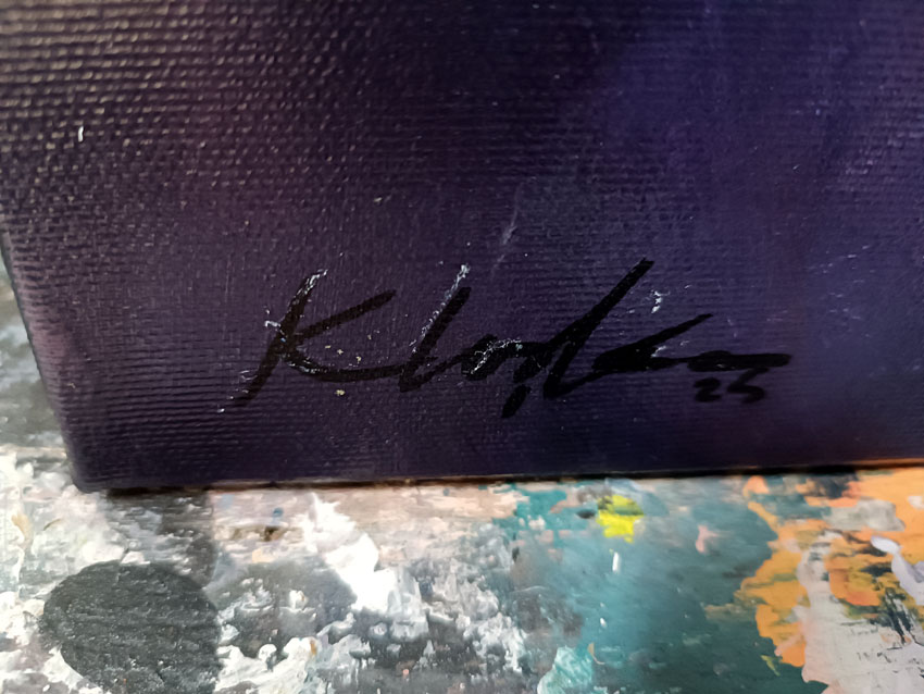 In Angel Waiting – Composition 228, Ovidiu Kloska captures the essence of a dark blue gothic abstract angel, intertwining vivid colors and abstract forms to evoke a sense of profound spirituality. This piece draws inspiration from the rich mural traditions of a small Romanian village, where the echoes of archangels linger in the artist’s childhood memories.