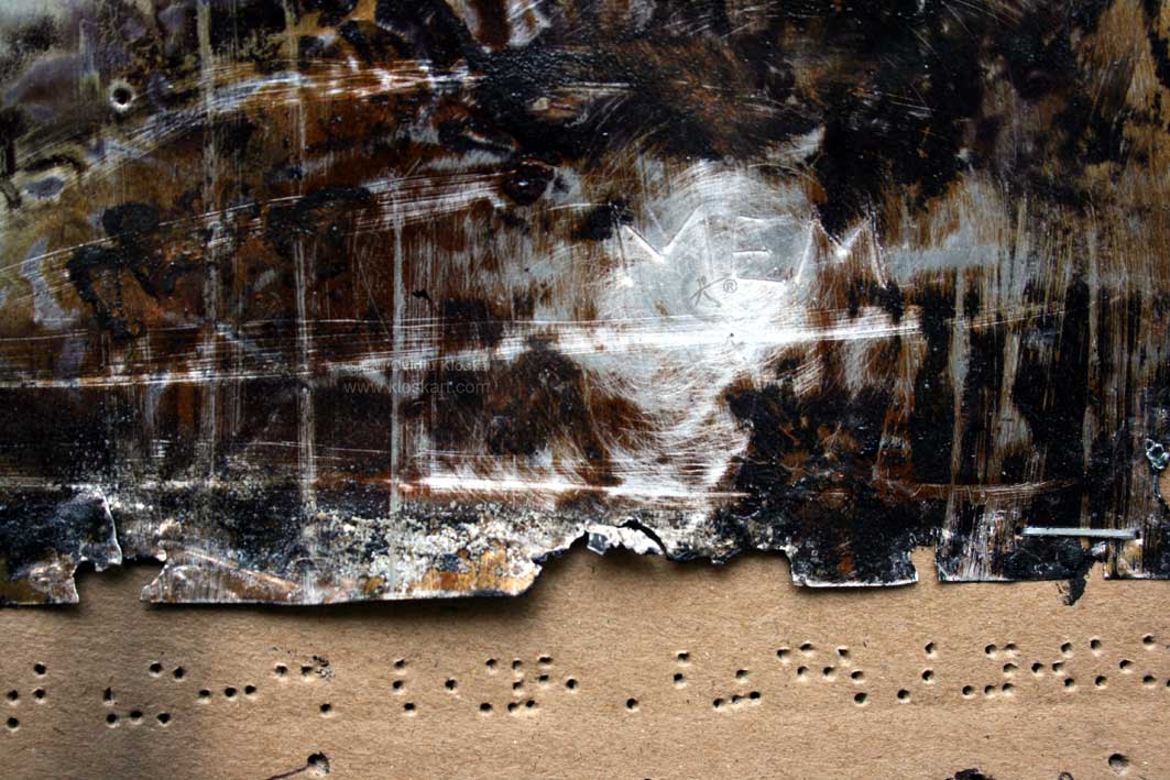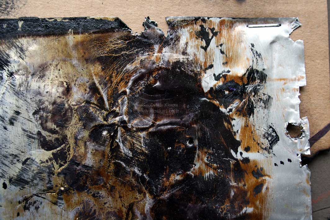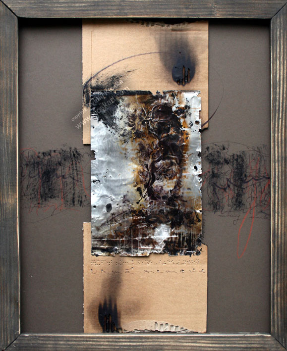 Tehnique:   own tehnique on metal, burned cardboard, sepia passpartout, wooden frame