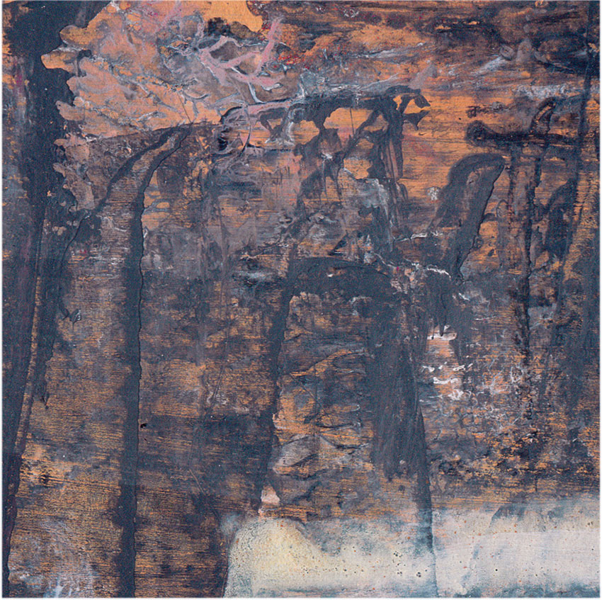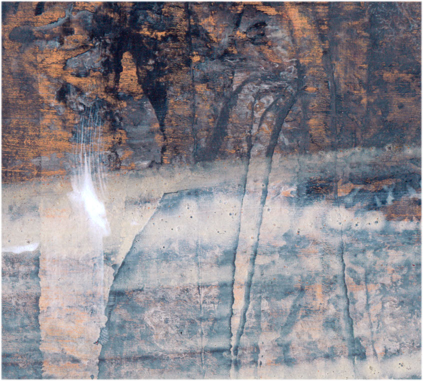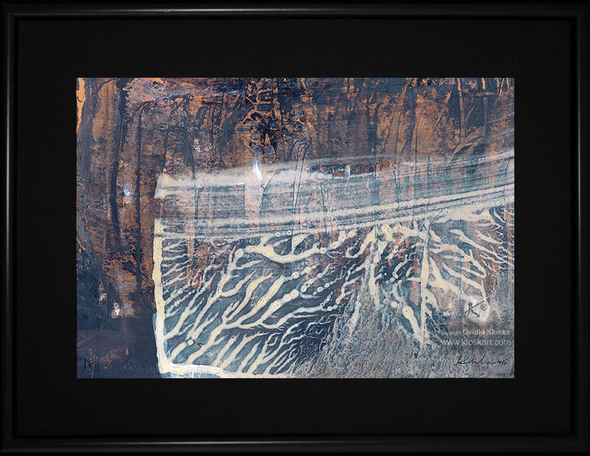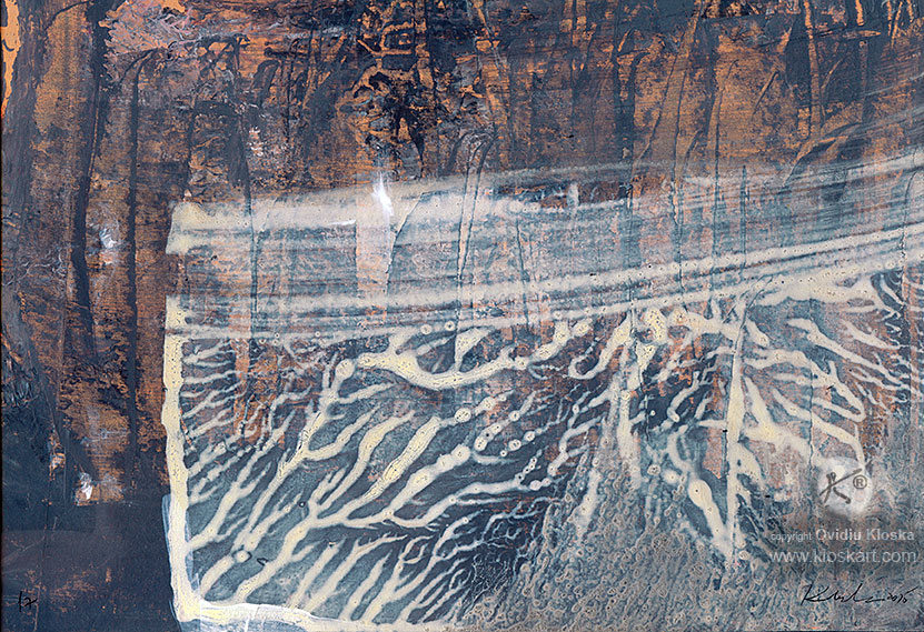 UNIQUE ONIRIC PAINTING SIGNED BY ROMANIAN MASTER OVIDIU KLOSKA – ABOUT COSMIC ENERGY / PERENITY/ LIGHT SIGNALS TERAIN ANCE STRAL LANSCAPE – DECALCOMANIA